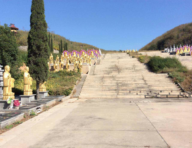 园区现已建成雄伟的山门牌楼,高大壮观,气势恢宏,道路和公路绿化规划的墓区依山而建,错落有致,层次分明,长廊,水榭,景亭,花园,祭坛,金水桥,坐山大佛点缀,其中布局合理。增添了无限秀色,礼仪大厅,塔亭、阁、园建在山顶与山脉之中,人文走廊及汉白玉台阶景景相连,背靠群山龙脊,青岚叠翠,喷泉放生池、长廊、人文景观点缀其中,开屏列账,宽敞明亮,有专用祭拜台,享受帝王之尊贵,存埋神位设计独特。